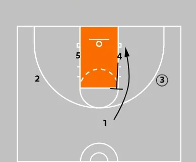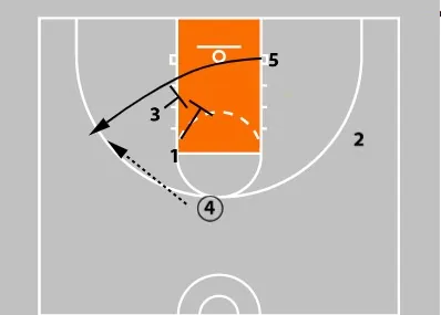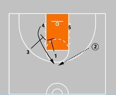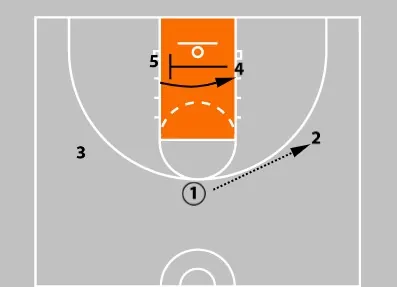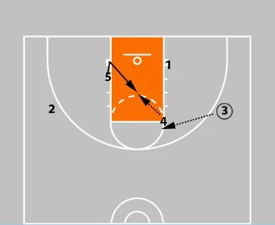 As the ball is entered to the wing, the ball-side post (4) sets a block-to-block screen for the opposite low post (5).