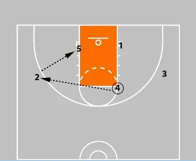 If that pass is not available, the high post can skip the ball to the opposite wing (2) who again looks to enter the ball into the post (5).