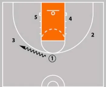 At that point, the 3-Man runs across the floor using three screens. The 1-Man dribbles back towards where the 3-Man will end up.