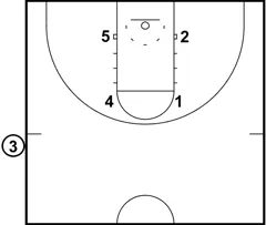The play begins with 3 taking the ball out of bounds. 5 starts on the left low block. 2 starts on the right low block. 4 starts on the left elbow and 1 starts on the right elbow.