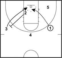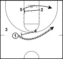 At the same time, 2 sets a screen for 5 who goes low and continues until he is outside the key.
