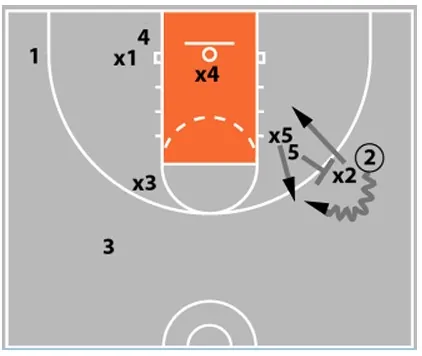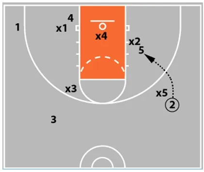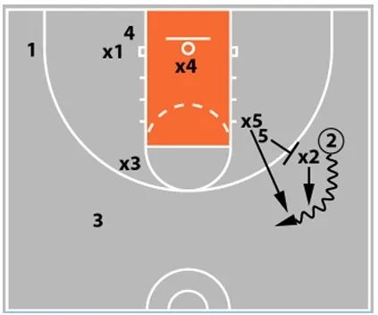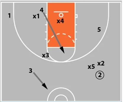 If x4 is helping across on a post entry, 4 could flash to the high post for a hi-lo opportunity or free throw line shot.