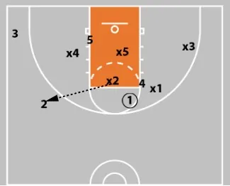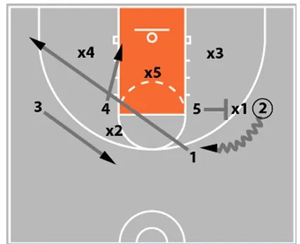 - 5 goes and sets the middle ball screen on x1 for 2. 2 attacks the free throw line area.