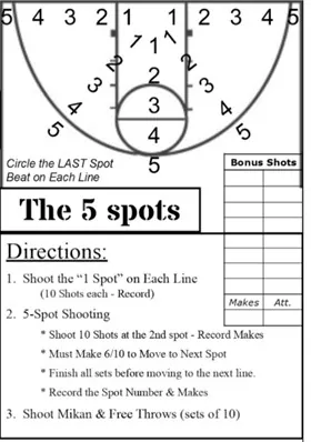 The workout consisted of players shooting "lines" in practice, for example from the basket to the corner, wing, top of the key, etc. We dropped floor spots every four feet along that line. Players started at the One Spot (4') and took ten shots. If they made at least 6/10, they moved to the Two Spot (8') and took ten shots. This process repeated until they got to the Five Spot (3-point line). If a player failed to make 6/10, they repeated the spot. A typical workout included: