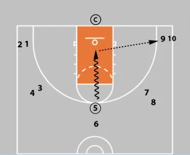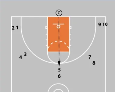 • The player with the ball will drive into the paint and execute a 1-2 stop.