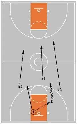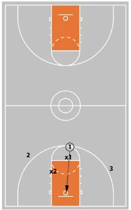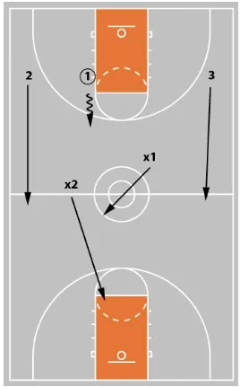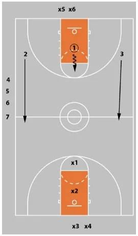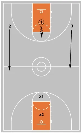 Many times, you start with one defender under the basket and one defender at the top of the key.