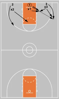 • When the ball is in the middle third, the defense's goal is to force the offense to the outer third, preferably forcing them to dribble with their weak hand (see 1 being pushed left above).