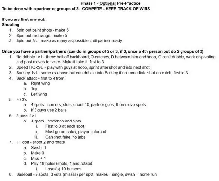 • Create a pre-practice routine for your players - Here’s an example I used. We did not require players to do this. If they wanted to hang in the locker room until practice started, they could. However, if they came out, they were expected to start working on the pre-practice list. It was a way to help them improve without a coach’s supervision.