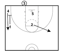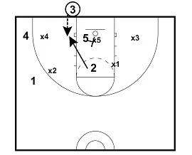 - 5 and 2 screen across. 5 should find the center of the zone and screen. 2 can screen either top defender (X1 or X2). It doesn't really matter.