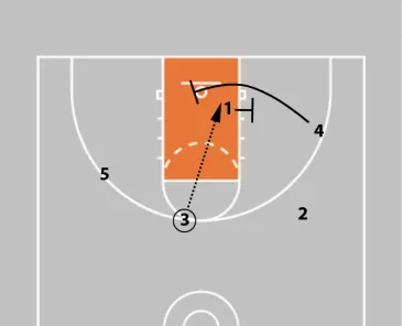 • If 4's defender switches onto 1, 1 will seal them, allowing for an interior pass and layup for player 1.