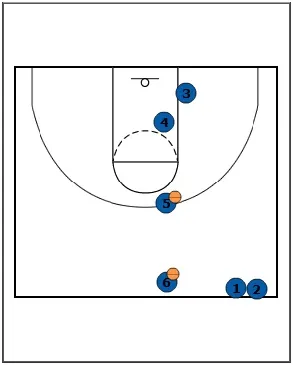 • Shooters (1 and 2) become rebounders. Passers (5 and 6) become shooters. Rebounders (3 and 4) become passers.