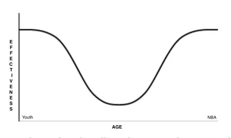 If you put age on the X-axis (horizontal) and effectiveness on the Y-axis (vertical), it would look something like the image above.