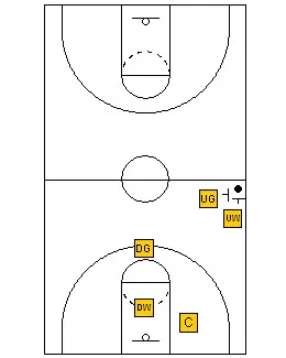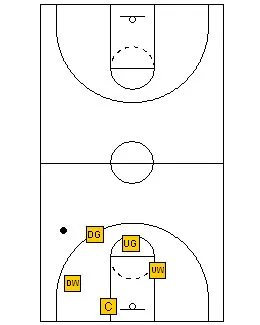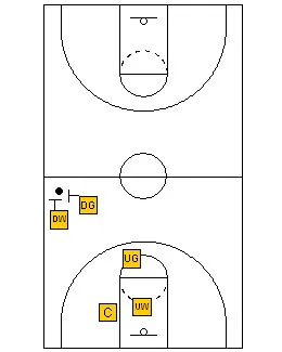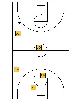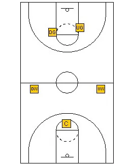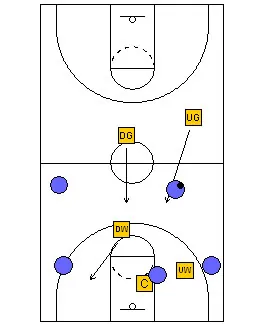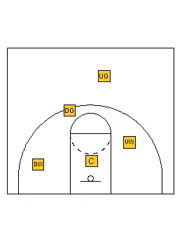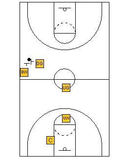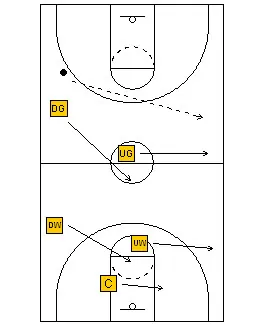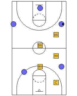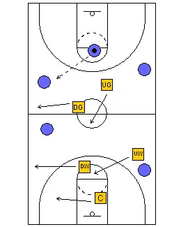 The rules are still the same. The Up Guard plays the ball on top. The Up Wing plays the first pass on the up side, the Center plays the low post and the second pass on the “up” side. The Down Guard plays the ball on the down wing on the “down” side and the down wing plays the corner on the “down” side and the low post on the “up” side.