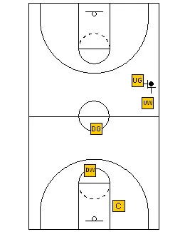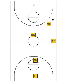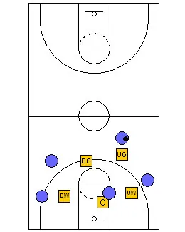 The down guard gets ahead of the ball and is in weak side help, preventing a middle pass and dribble penetration. The up wing guards the ball side sideline, the down wing is “straight line circle” behind the down guard, guarding against a penetrating pass to the middle, and the center is protecting the basket, shading the ball side.