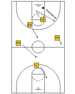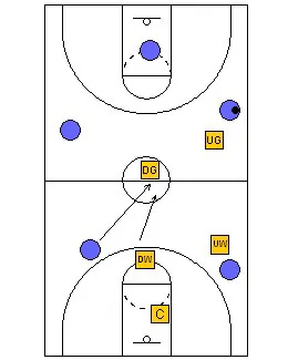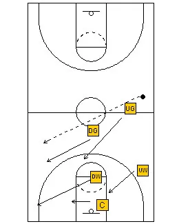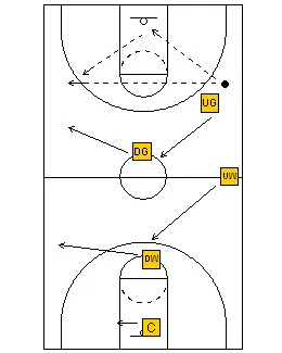 When the ball is reversed, the defense shifts. If the ball goes from the wing to the opposite wing, the down guard plays the ball, the up guard retreats, gets ahead of the ball and defends the middle. The up guard must make sure he gets ahead of the ball and the up wing does the same. The down wing adjusts to defend the ball side sideline. If there is an offensive man in the middle, he waits until he is bumped, either by the up guard or by the up wing. The center protects the basket and shades the ball side.