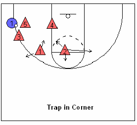 - The ball side guard (x1) positions themselves on 1’s outside shoulder and attempts to play between 1 and the corner player (3). This makes the pass to 3 difficult.