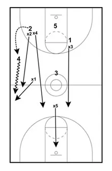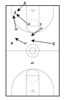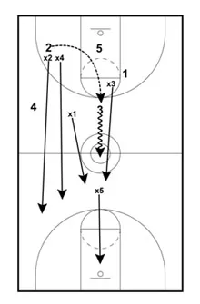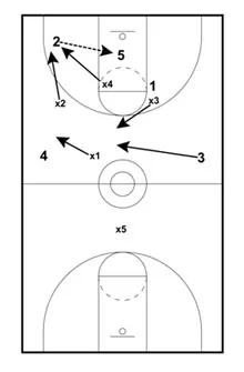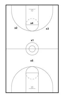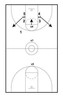 X4 is for the post player closest to the basket. X2 and X3 are for the two guards closest to the basket. X1 is for the guard furthest from the basket. X5 is for the post player furthest away from the basket.