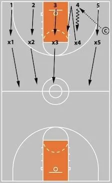 For example in this diagram, as the ball is pushed down the floor on the right side, the defense on the opposite side of the floor should either be on the rim line playing help defense, or a minimum of a foot in the paint.