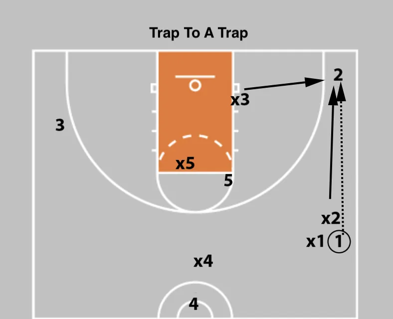 Unless the 2 is a very bad player, they will have a great opportunity to either shoot, or attack on the closeout by x3, as x3 waits for x2 to arrive and trap.