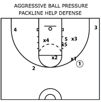 So you could complement aggressive ball pressure with packline help defense principles or some variation. You’re not actively denying passes outside of the 3-point line. You are positioned in a gap to immediately stop penetration.