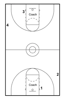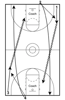 1 and 3 start out with the ball. 2 and 4 are at the free-throw line extended.