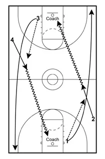 1 and 3 will sprint to the right corner. 2 and 4 will dribble the ball all the way to the basket for a layup.