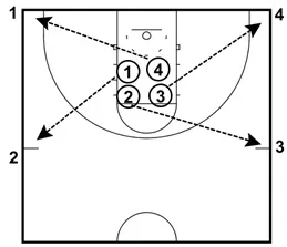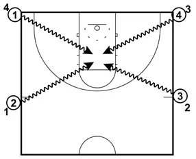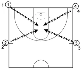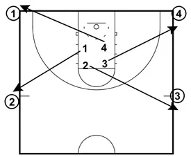 All four players will make a chest pass to the line that is now in front of them (1 will pass to 2, 2 will pass to 3, 3 will pass to 4 & 4 will pass to 1, as shown to the right). The players will be passing to the corner in a counter clockwise rotation.