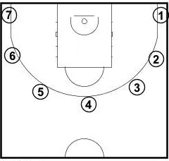 Starting with 7 spots, shooter starts in the right corner and runs from spot to spot and takes a shot from each spot. Player attempts 10 shots.