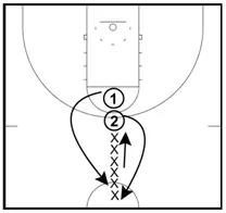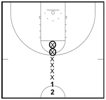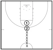 The game begins with all players lined up in a straight line starting at the free throw line and extending towards half court (see diagram #1). The first two players start with a basketball.