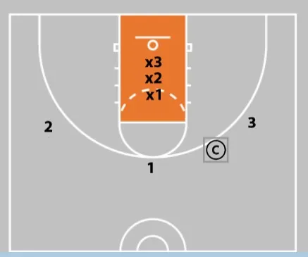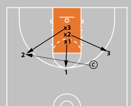 - The coach passes the ball to one of the perimeter players and calls out a number (1, 2, or 3). In this example, the coach called out "3."