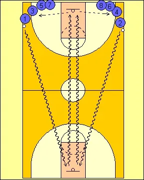 - Give two balls to each team. The second player starts when the first player has executed his lay up (this only applies to the first run). This variation is highly recommended if you have two teams of 4 or more players.