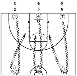 • I set up the drill this way because I only had one basket I could use at practice. To maximize repetitions, you could have 2 players per basket. Then you could start all of the players across the gym at the same time.