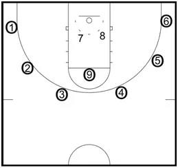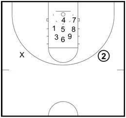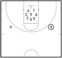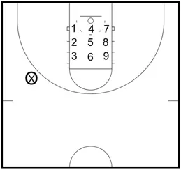 Step 1: The drill begins will all players in the key waiting for the coach to take the initial shot.