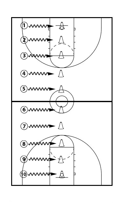 If you want to use this drill in your team practice, line chairs or cones up in the middle of the court and have everyone run the drill at the same time. Practice each move/drill for 20-40 seconds. This is a very efficient way to work on ballhandling (because everyone has a ball in their hands). And it's a great conditioner!