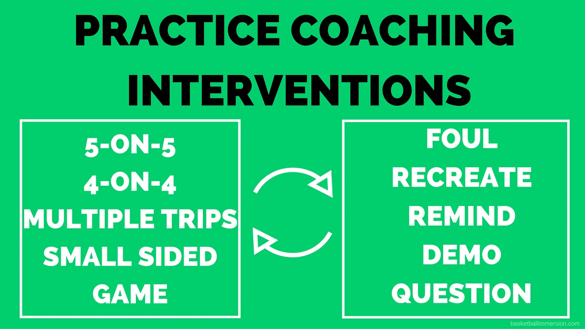 Here are the coaching interventions we use within our games approach to coaching basketball. We use these words to coach our players. A foul means there was a mistake that we need to correct. Recreate means we are going to go back to create a situation again to teach; this gives our players a context for what we are trying to improve. Remind means we are going to remind our players about a concept we have coached already that they are not executing. Demo involves us demonstrating a concept within the game to help our players see what they are doing well or what they need to improve.