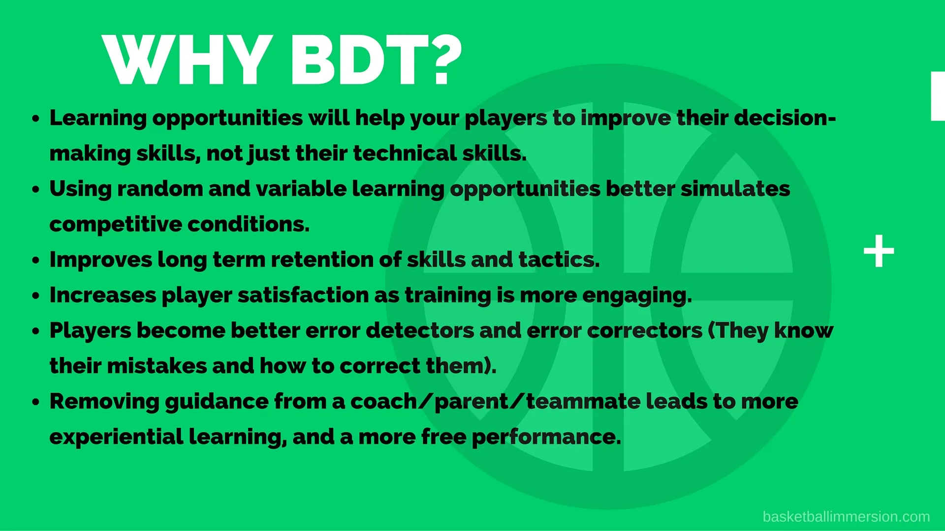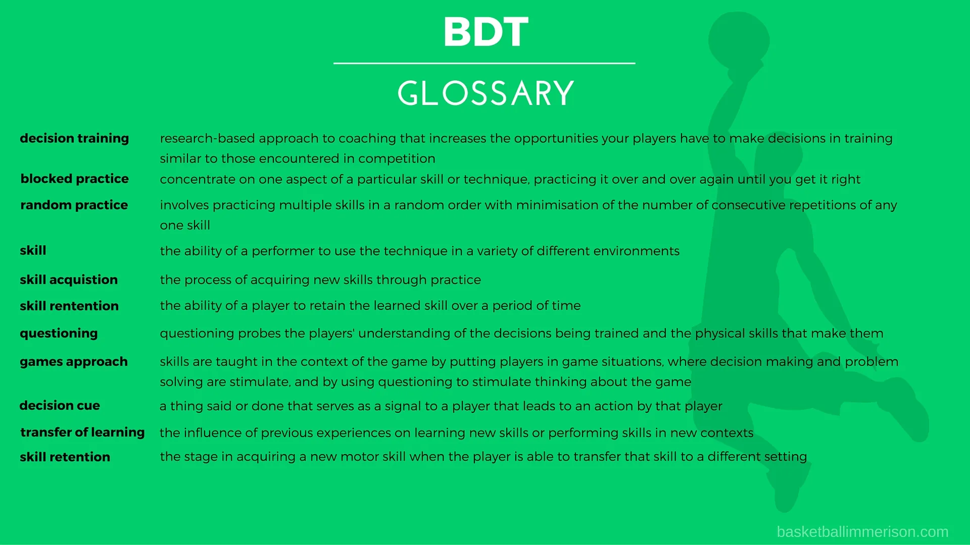 This answers the question of how to practice using a games approach. The next challenge became, how I can better train my players individually? Ideas from many sport researchers and coaches from different sports have led to what I call BDT (Basketball Decision Training). The goal of BDT is to provide learning opportunities that help players to improve their decision-making skills, not just their technical skills. It uses random and variable learning opportunities to best simulate competitive conditions.
