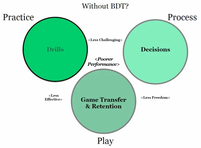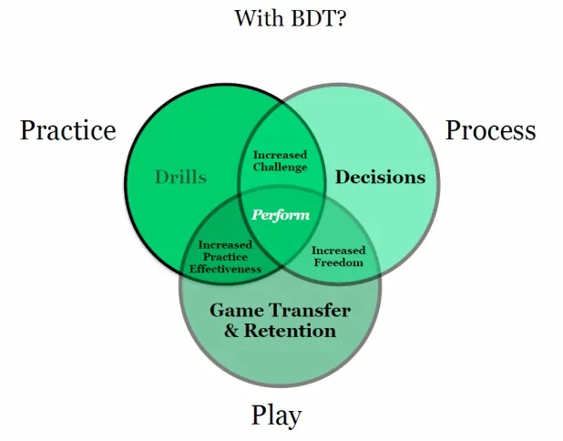 There is a significant challenge in using BDT and a games approach to coaching. It is a difficult sell to players, parents and administrators who are used to practices looking and feeling a certain way. Players are often frustrated when using random practice because many mistakes are made and learning seems slow so your practices won’t look as good. Coaches should inform players, parents and administrators that random practice is useful because of the high transfer and that they will be able to perform a skill better in the long run.