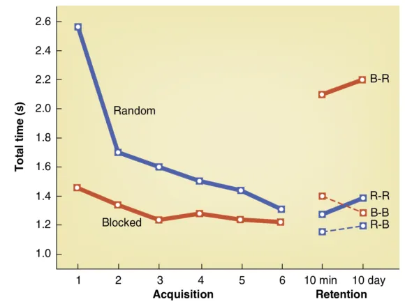 However, the random practice group (R-R) retained their times. 10 minutes later, they were close to an average of 1.2 seconds. And 10 days later, they were slightly below 1.4 seconds.