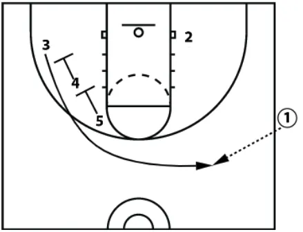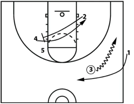 This time the player (3) coming off the staggered, getting the inbound pass, fakes the handoff back to the inbounder (1). At the same time, the player who curled (2) sets a diagonal screen for the big (4) to the block.
