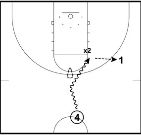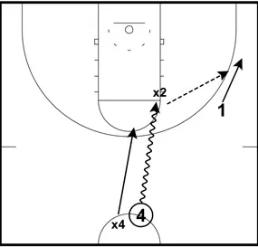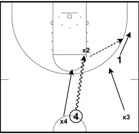 4 makes the dribble move and looks to score. The defender gives the offense different looks to force different actions.