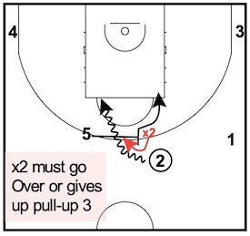 This makes it more likely for the on-ball defender (x2) to get caught and force a mismatch with the Big (x5).