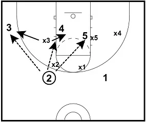 2 can pass to 3 in the corner for the open shot, 4 on the block, or hit 5 sealing on the backside.