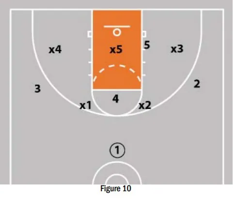 In Figure 10, the wings (2 & 3) are located halfway between the top and bottom players in the zone. This forces the nearby defenders (for example, x2 & x3) to decide who is going to cover that area.