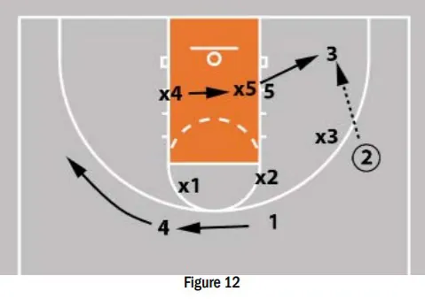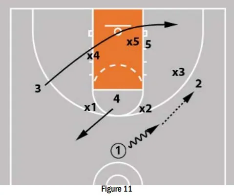 In Figure 11, the bottom defender (x3) plays the first pass to the wing (2). The middle player in the zone (x5) must guard the low post threat (5). This creates a sizeable opening in the short corner for the cutter (3) to fill.