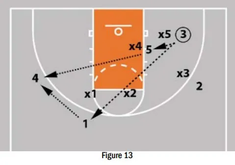 Figure 13 demonstrates the short corner options when the bottom wing (x3) is extended. Here, a pass to the top of the key (1) or through the post player (5) leads to a ball reversal. The next pass to the weak side threat (4) creates a wide-open opportunity.