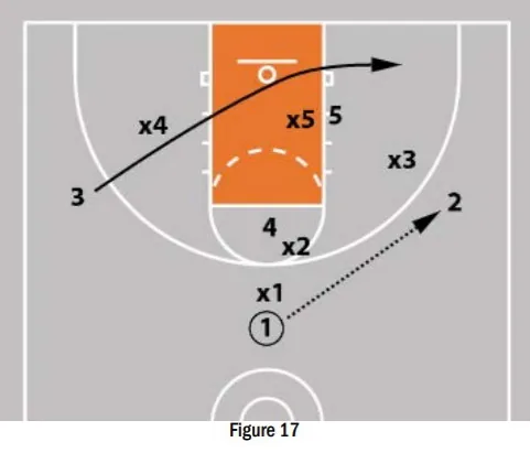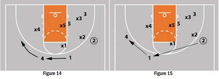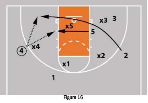The offense maintains an advantage even if the defense successfully negotiates the quick reversal. When the bottom defender (x4) guards the wing, another 2 on 1 situation is created by the next pass to the short corner or low post (Figure 16). The wing defender (x4) cannot leave the ball until bumped by the top defender (x1) creating time and space for the short corner (2) and low post (5) to attack the middle defender (x5).