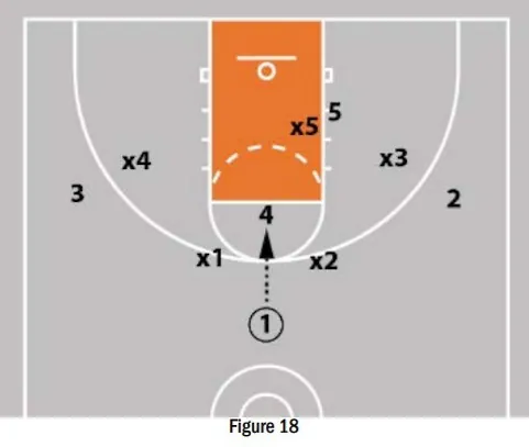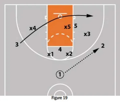 If the top two defenders pinch the high post to deter an entry pass from the point guard, then a passing lane to the wing is open creating an immediate strong side advantage (Figure 19).