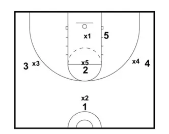 The positions are as follows on defense: X2 is at mid-court, X3 and X4 are on the wings, X5 is at the high post, and X1 runs the baseline. The defense will look to make a trap in the “coffin” corners.