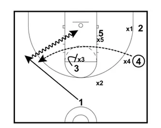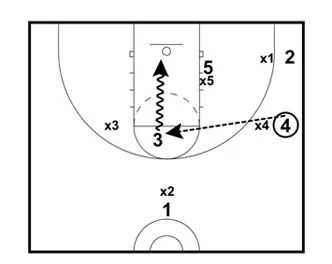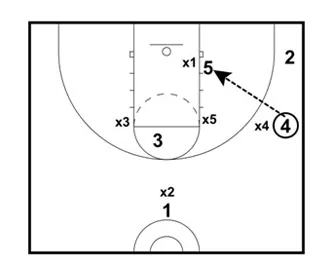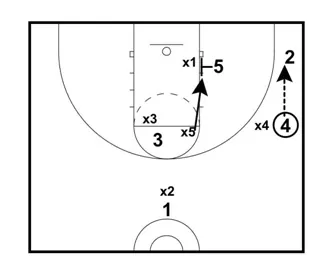 If X5 covers 5 and if X1 covers 2, pass it to 3 at the high post for an open jump shot.