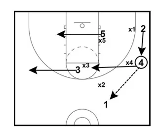 If none of these options are open, pass back to 1. 2 flashes to the right wing. 3 moves to the left wing. 4 flashes to the high post. 5 moves to the left block.